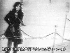 スティーブンがマイク攻撃に泣きベソをかいている頃、パティの事件はとてつもなく面白い方向に進行していた。 「少しでも動いてごらんッ。脳天にお見舞いするからねッ」。 うわあ。《パルプ・フィクション》のオープニングみたいなカッコいいセリフ。 「床に伏せなッ。 あたいたちを馬鹿におしでないよッ」。 三人組強盗団の構成員を立派に演じたパティは(残りの二人は「テコ」と「ヨランダ」のハリス夫妻)、今やSLAからは「信頼できる同志」、FBIからは「犯罪者」の烙印を押されるに至った。FBIの全国指名手配はパティのパパやママを苦しめたが、パティからの犯行声明がこれに追い討ちをかけた。 「私は何人からも強制された訳ではない。自らの意思に基づき、自らの判断で行動したのである。私の役割は客や警備員のホールド・アップであった。もちろん、私の銃は弾丸が装填されていた。いつでも脳ミソを粉砕するだけの準備は私には出来ていた」。 |