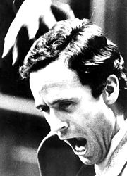 1978年1月15日午前3時、フロリダ州立大学の学生ニタ・ニアリーは恋人に別れを告げると、裏口からこっそりとカイ・オメガ女子寮に帰宅した。ふと正面玄関から外を見ると、そこには一人の男が棍棒を握りしめて立っていた。ただごとではない。通報しようと電話に急ぐと、カレン・チャンドラーが血みどろでよろめき出てきた。頭を殴られている。キャシー・クライナーもやられていた。顎が砕けている。マーガレット・ボーマンとリサ・レビーは血の海の中で倒れていた。マーガレットは既に息絶え、リサも救急車の中で絶命した。 バンディは何故、こんな大それたことをやらかしたのだろうか? 派手な行動は自分の居場所を教えるようなものだ。長い拘束からの解放感が彼の理性を狂わせたのだろうか? 女子寮の惨劇を繰り広げたバンディは、しばらくは偽名でその地に潜伏していたが、誰も自分がバンディと気づかないことに業を煮やしたのか、車を盗むとシアトルの方角へと旅に出た。そして、最後の犠牲者、12歳のキンバリー・リーチを手にかけた直後に逮捕された。 バンディの裁判はテレビ中継された。まるで我々がオウム真理教に見入ったように 合衆国市民全員がバンディの裁判に注目した。 1979年7月23日、人々の期待通り、バンディは死刑を宣告された。判決に際してのカワート判事の発言が有名である。 |