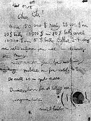 事件から1週間が経とうとしていた頃、72歳の非常勤講師、ジョン・フランシス・コンドンがブロンクスの地元紙に広告を出した。事件が進展しないことに業を煮やした彼は、仲介役に名乗りを上げ、加えて自らの生活の蓄え1000ドルも提供する旨を表明したのである。当初は世間も彼の家族も冷ややかだったが、犯人にとっては渡りに舟だったようだ。翌日にも「3つの円のマーク」付の手紙がコンドンの元に届いた。手紙の中で犯人は、コンドンがリンドバーグから金を受け取った後、『ニューヨーク・アメリカン』紙に「金を用意した(Mony is Redy)」と広告を出せと要求していた。 |