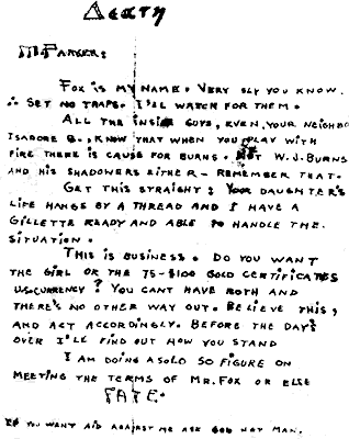 翌日の朝に届いた速達で「ジョージ・フォックス」と名乗るその男は、マリオンと引き換えに1500ドルを要求してきた。そして、次の日の夜に犯人からの電話が入る。