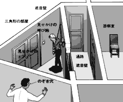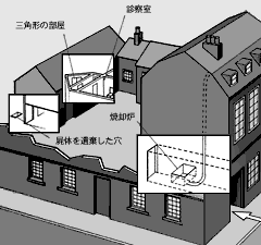 問題の屋敷はパリに移ってからのプティオの診療所だった。内部を捜索した警察は、診察室の奥に奇妙な三角形の小部屋を発見した。 |