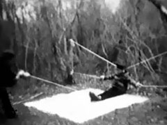 次のショットはこの映像の中で最も痛ましい。台を取り除かれて首を吊られた少年が暴れ回り、隣の木に足をかけて生き存えようとするのだ。これをスリフコが慌てて妨害する。あくまで重力に従わせようとするのである。己れの体重もかけているようにも見える。