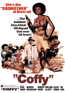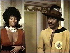 ヒルの演出はとにかくテンポがいい。冒頭で、いきなりディーラーの脳天をショットガンで吹き飛ばす。キング・ジョージ(写真上)の描写はさらに凄い。ヒルはこのディーラーをテーマ曲まで作って鳴り物入りで登場させておきながら(「彼はキング・ジョージ。ワーオ。男の中の男」とかいう歌詞)、わずか10分ばかりの出番で早々に殺してしまう。いったい何のための「キング・ジョージのテーマ」だったのか?。私にはさっぱり判らないが、このあたりの「破綻型演出」が、ヒルの魅力なのである。 『コフィー』にはこのような、ギャグなのかマジなのかよく判らない演出が満載だが(例えば、警官がコカインを吸引して、張り切って出動したりとか)、そのすべてを挙げていると切りがない。 |