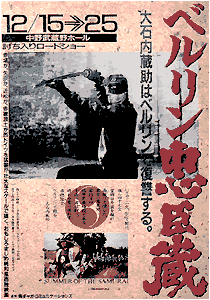 現代のドイツに大石内蔵助が蘇り、悪徳企業を成敗する。撮りようによってはドタバタになりかねない内容を、日本贔屓の監督が情緒過多に撮ったために、極めて退屈な作品に仕上がった。邦題に騙されてはいけない。この映画はコメディではないし、ベルリンなどどこにも出て来ない(舞台はハンブルグ)。なお、このいい加減な邦題の名付け親は『死霊の盆踊り』の江戸木純氏である。 ところで、この映画が我が国でリリースされた数年後、ベルリンの壁が崩壊したが、その記念番組として本作がNHK衛星放送で放映されたのにはキモを潰した。案内役は樹木希林。しかもベルリンからの衛星生中継だった。いったい何を考えていたのだろうか?。 |