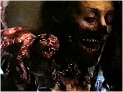 ポーの短編を現代風にアレンジしたオムニバス作品。『ゾンビ』を放ったロメロとアルジェントが12年ぶりにタグを組んだ話題作だったが、いずれファンにとっても物足りない、中途半端な仕上がりとなった。 まずは、ロメロが監督した『ヴァルドマー事件の真相』。臨終の人間に催眠術を施すことにより、どれだけ延命させることができるかを描いた原作に、遺産を巡る愛憎劇を加味し、最後には観客の期待通りにゾンビ登場で幕を降ろすが、出来はあまりよろしくない。この程度の話に1時間は長過ぎる。ロメロが製作していたTVシリーズ『フロム・ザ・ダークサイド』の30分枠がちょうどいい長さである。 続いて、アルジェントが監督した『黒猫』。妻を殺してしまった男が、黒猫の怨霊により破滅する物語だ。基本線は原作と同じだが、主人公を屍体専門のカメラマンにしたことでアルジェントの猟奇趣味が炸裂。『陥穽と振子』をモチーフにした凄惨な殺人現場も登場し(左写真上)、 ゾンビと美少女イジメで名をなした監督には、ポーのような古典は不向きなのかも知れない。 |