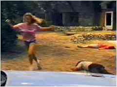 史上最悪の連続殺人鬼、ヘンリー・ルーカスの映画といえば『ヘンリー』があるので、こちらの方は忘れられがちである。しかし、こちらの方も悪くない。B級にしては上々の出来である。「どうせロクなもんじゃねえんだろうなあ」とナメてかかって観ていたら、ついつい引き込まれてしまった。 前半は、正直云って退屈である。逮捕されたヘンリーが犯行を一つ一つ告白していくという構成で、「最後までこの調子だったらどうしよう」と不安になった。 恐ろしいのは、この3人が日常においてごく当たり前に人を殺す、ということである。例えば、買い物をして、財布を忘れたので店主を殺す。自動車が欲しいのでヒッチハイクをしてドライバーを殺す。まるでバイト感覚の殺人なのだ。否。ゲーム感覚と云うべきか。暇な時は通りすがりの少女を射殺するのだ(左写真上)。あたかも射的で遊ぶかのように。 |