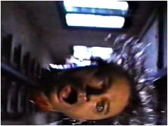 ところが、ブラッド・ドゥーリフの首を切断しようとした時に、針金が彼のネックレスに絡まって電動機がショートしてしまう。仕方がないのでエレベーターまで引きずって、昇降路に頭だけ突っ込み、下りボタンを押すことで切断する(左写真下)。自作『サスペリア2』のパロディ的なシーンであるが、興味深いのは首を切断されてもドゥーリフにはまだ意識があり、