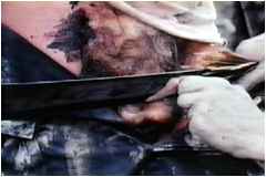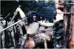 一度この手の映画に出演して強烈な演技を披露すると、同じような映画のオファーばかりになってしまうものだ。 ルッジェロ・デオダートによる『鮮血の美学』の亜流作『真夜中の狂気』でデビューした彼は、ウンベルト・レンツィの「元気のいいゾンビ映画」『ナイトメア・シティ』でゾンビの一人を演じ、そして、ルキオ・フルチの『地獄の門』でブレイクする。 続くオファーはアンソニー・ドーソンの『地獄の謝肉祭』。ベトナムで人肉の味を覚え、帰国後も「あの味」が忘れられずに犯行を繰り返す食人鬼役で、ショットガンで撃たれてドテッ腹に風穴が開くという「おいしい役」をまたしても頂戴した。 その次に来たオファーがこの『人喰族』。遂に主役に昇格だが、ここでの彼は惨々だ。まあ、土人たちに非道の限りを尽くした挙げ句の自業自得の仕打ちなのだが、捕らえられて手首を切られる。そして、柱に縛られてチンポコを切断される。そのまま一昼夜生かされて、翌日になって脳天を寸断されて絶命。脳みそを喰われた上に三枚に下ろされて刺身になる。 頭を串刺しにされるわ、ドテッ腹に風穴は開くわ、チンポコ斬られるわ、そんな役ばかりで、つくづく因果な俳優である。 |