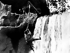 そして、滝の手前でどうにか留まり、同様に流されるヒロインをジャンピング・キャッチ。さすがに本物の滝ではなく、撮影所に拵えたセットだが、それでも至難の技であることには変わりない。観客は拍手喝采である。
