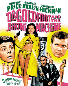 ジェームズ・H・ニコルソン(ジャック・ニコルソンの叔父)とサミュエル・Z・アーコフ率いるAIPお得意の「ほのぼのエロス」のお笑いゴーゴー映画である。 AIPの映画はすべてが「ほどほど感」に支配されている。予算もほどほど。中身もほどほど。それなりの娯楽を提供してはくれるが、それ以上のものはない。AIP映画で人生を変えられたという人は滅多なことでは存在しないだろう。 ビンセント・プライス扮するゴールドフット博士の野望はもちろん世界征服。そのためには蓄財しなければならないと、ロボット美女軍団「ビキニマシン」を製造し、世界中のお金持ちと結婚させようと企んでいた(ほどほどのスケール)。それに気づいたボンクラ秘密諜報部員001/2がドタバタとズッコケながらも野望を打ち砕く。 ギャグははっきり云ってドリフ並み。拳銃で撃たれた「ビキニマシン」が牛乳を飲むと穴からピューッとこぼれるシーンを始めとして、今どき子供番組でもやらないギャグばかり。「小学校低学年向け」という注意書きが見えてくるかのようだ。しかし、ビキニのゴーゴー・シーンがあるからには大人向けなのであり、観客も随分バカにされたもんである。 それでも、本作はほどほどにヒットしたようで、翌年には続編が製作されている。『ゴールドフット博士とガール・ボム』というタイトルで、今度は「ビキニ爆弾」の話らしい(監督はなんとあのマリオ・バーヴァ)。思うに、『オースティン・パワーズ』に出てきたロボット美女軍団「フェムボット」の元ネタは本シリーズなのではないだろうか。 |
