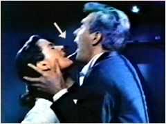 ラストもかなりの噴飯物だ。 なお、兄博士がフィアンセにチューをするシーン。腹を撃たれると兄博士は「うわっ」と仰け反る。その時に、彼の口元に光る筋が見えた。スローで再生してみると、それは確かに「よだれの糸」であった(左写真矢印部)。糸が張るほど真剣にチューをする兄博士の熱演ぶりには感動させられた。 |