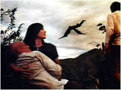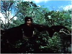 ストーリーはいわずもがな。人を誘拐してきては様々な動物とかけ合わせてて喜んでいるゴードン博士。「アリとガチョウでアリガチョウ」とシャレていた赤塚マンガの気狂い博士とレベル的には変わりない。獣人たちのメイクも、いったい何の動物とのあいのこなのかよく判らないヘタクソで、この手の映画に必ず登場する筈の改造手術シーンもなく、見どころは皆無に等しい。 ただ唯一、貧相な翼をつけた奴だけがどうにかコウモリ男だと判別でき、こいつの獣人的成長ぶりはなかなか笑える。コウモリの本能に従って、木の枝に逆さにブラさがってはみたものの、頭に血が逆流して貧血を起す。翼をはばたかせて木から飛び立てば、ドリフのコントのように地面に激突する。 しかし、獣人たちの主治医であるゴードン博士が死んでしまい(なんか雑草みたいな妻に殺されてしまう)、彼らをもとの人間に戻してくれる人がいなくなってしまった今、いくら自由になったからといって、獣人たちにとってはハッピーエンドなのか?。疑問である。 |