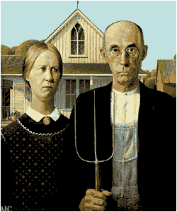 左の絵画はグラント・ウッドによる「アメリカン・ゴシック」と題された作品である。1930年という製作年度から察するに、「狂騒の20年代」が齎した旧モラルの崩壊を憂う「ゴシック」な人々の肖像なのであろう。だから、そこから滲み出るのは「家庭的な明るさ」ではない。「ピューリタン的な厳格さ」である。