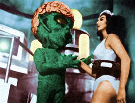 THE SHIP OF MONSTERS メキシコ 1959年 81分 子供向けのSFコメディ。 この脳ミソまる出しの化け物は女宇宙人の家来で、 地球侵略の手先として働くが、パチンコ玉で殺される。 |