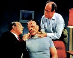 『心霊移植人間』と『怪人フランケンシュタイン』のメイクを流用して製作された作品。「うちではもう怪奇映画はやらんよ」とAIPをクビになった特殊メイクのおじさんが、バカな若者を「イケ面にしちゃる」とダマくらかしてモンスターに改造、AIPに攻撃を仕掛ける、という楽屋落ちの物語らしい。AIPはこういう廃物利用が得意である。