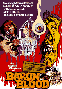 物語は『ブラディ・ピット・オブ・ホラー』にやや似ている。16世紀に非道の限りを尽くしていた「血みどろ男爵」の怨霊が現代に甦って悪さをする。前半は、甦ったばかりなので全身が血肉でデロデロの「血みどろ男爵」がヨタヨタと殺しを繰り返すのみで、正直云って面白くない。おいおい、このまま行くのかよと思っていたら、後半から車椅子の怪しげな大金持ち、ジョセフ・コットンが登場。古城を買い取り「血みどろ男爵ツアー」として地下拷問室のテーマパーク化を企む。面白いじゃないか。