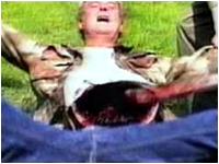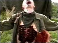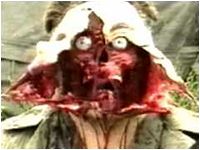 本作のビデオは、以下のような日本語のテロップとともに始まる。 「99年7月、3人の男が孤島に上陸したまま行方不明になった。その後、孤島の様子を撮影したフィルムが漂流してるのが見つかった。 『ブレア・ウィッチ・プロジェクト』のバッタもんとして始まるこのビデオ、そのまま見ているとどうも様子がおかしい。セリフはドイツ語だし、ちゃんとカット編集が施されている。『ブレア・ウィッチ』とは明らかに作りが異なるビデオドラマだ。そして、はらわたがベロベローンと出てきた時点で気づくのである。しまった。だまされた。これは『ブレア・ウィッチ』じゃない。『ギニーピッグ』の方だ、と。 さすがにこのビデオを『ブレア・ウィッチ』と間違って借りる人はいないだろうが、パッケージのデザインがよく似ているので、姉妹編かと思って借りた人も多いのではないだろうか?。しかし、こうしたデザインや冒頭のテロップは日本の配給会社が仕組んだこと。まったく関係ない(バッタもんでもない)ドイツ製のスプラッター・ビデオである。スプラッター・ブームの去った後では、そのままリリースする勇気がなかったのだろう。 |