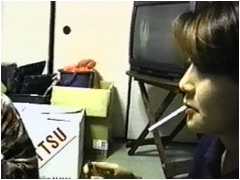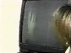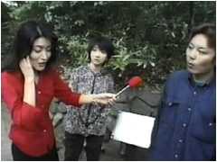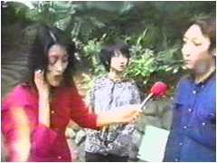本作ではこの他にも計9本の「心霊ビデオ」が紹介される。しかし、いずれも明らかにトリックと判るシロモノでロクなものではない。結局、一番出来がよかったものをメインに据えたという印象だ。 「そういう駄作があえて折り込まれることで、心霊ビデオの基本的かつ他愛のないトリックを、戦略的にさらしものにしているのだろう。(中略) ここで私が思い出したのが『食人族』である。 なお、「ロクなものではない」残りの9本の中にも、1本だけ、かなり不気味なものがある。生放送中の電波が乱れて、レポーターたちの顔が醜く歪んでしまうのである(左写真)。『リング』の二番煎じに過ぎないが、私には「岩井さんのビデオ」よりも怖かった。 |