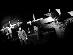 それでも、ラストの外連味たっぷりの怨霊シーンには唸らされる。特に、外人墓地にズラリと並ぶ銃殺刑の血みどろ死体(下写真)の残酷美にはしばし呆然とさせられる。さすが、名匠中川信夫。いい仕事をしている。