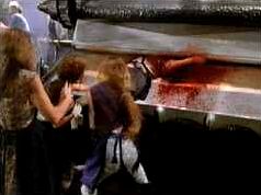 この機械には、先の工場のとは違い、ちゃんとブレーキがついている。しかし、そのブレーキが作動せず、おばちゃんが一人、巻き込まれてしまった.....。