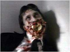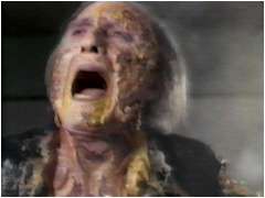 異色怪奇映画『ファンタズム』の9年後に作られた続編。しかし、前作が夢オチの上に、更にその夢オチを覆すどんでん返しで終わっているため、繋がりは極めて不自然だ。「取ってつけたような」とはまさにこのことである。 主人公のマイク少年は、トールマンと殺人ボールのおはなしを真顔で吹聴するものだから、然るところに入院させられていた。やがて、夢を通じてエリザベスという少女に魔の手が迫っていることを知ったマイクは、後見人のレジーを説得して、トールマン退治の旅に出掛けるのであった.....という物語である。 ところで、今回、トールマンは初めて死ぬ。体内に硫酸を注入されて、ドロドロに溶けてしまうのである(左写真下)。しかし、ラストでは何故か復活。暗闇からニュッと顔を出し、「小僧ッ!」と叫んで画面は暗転。エンド・タイトル。 |