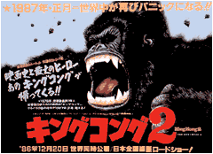 あのジョン・ウーが製作した『ビッグ・ヒット』というなかなか面白い映画があるのだが、この映画のラスト、主人公の殺し屋(凄腕だけどボンクラ)が様々な受難を乗り越えてレンタルビデオを返しに行くシーンで、そのビデオが『キングコング2』だったのにはかなり笑えた。脚本家のチョイスは適格だ。これが『死霊の盆踊り』だったら主人公はマニアになってしまうし、『タイタニック』だったら普通の人だ。『キングコング2』だったってことが、彼のボンクラぶりを余計に助長し、且つ「そんな下らないビデオを返却するために命を賭けるなよ」という笑いを産むのである。 前作『キングコング』もかなりのトンチキであった。「コンピューター操作による実物大のロボットで撮影」との宣伝に騙された私は、観客席から転げ落ちることとなった。(ロボットを使ったのは終盤の鎖を断ち切るシーンのみ。それ以外はリック・ベイカーによる着ぐるみである)。ポスターにあったジェット機ワシ掴みのシーンなどもなく、コングはヘリコプターによる機関銃攻撃に屈するのみであった。 |