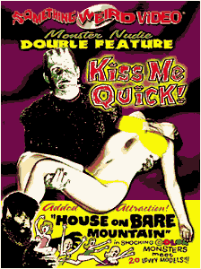 「最低映画の写真で一言」第31回の出題元である。 フランケンシュタインの怪物が裸の女性を抱きかかえる上の写真は以前から知っていて、はて、どんな映画だろう?。観たい、観たいと思っていたが、いざ手に入ると観る気が全く失せてしまっていた。ハリー・ノヴァクが製作した怪獣ポルノのいくつかをこの眼にした今となっては、だいたいの予想がついてしまうのだ。しかして、このたび「一言」に出題したのを機に観てみたが、予想を大きく上回るシロモノだった。この下らなさに比肩し得るのは『死霊の盆踊り』より他にないだろう。とにかく、もう退屈で退屈で、あ〜〜〜〜あ。欠伸の名人になってしまう。 内容は極めて単純.....というか、皆無である。 |
