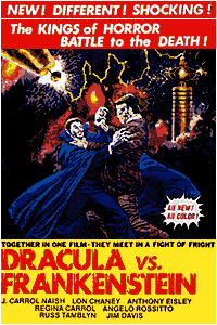 小学5年の時に肺炎を患った私は、自宅療養のために学校を1ケ月ほど休んだ。その1ケ月間は東京12チャンネル天国だったことは云うまでもない。「朝のロードショー」と「2時のロードショー」を観ることが毎日の日課となったのだ。B級SFやマカロニ・ウエスタンを随分と観たが、その中で観たくもないのに2回も放映された映画が1本だけあった。それがこの『ドラキュラ対フランケンシュタイン』である。 この映画、もともとはラス・タンブリン主演の暴走族映画として製作されたものらしい。しかし、あまりにもつまらないので、急遽、フランケンシュタイン博士を付け足した。ところが、まだつまらないので、更にドラキュラ伯爵を付け足したというトンデモない代物。史上稀にみるダメ映画だったのである。 監督のアル・アダムソンは、とにかくこんな映画ばかり撮っている人ってことで解説が十分な人。弟子には『死霊のかぼちゃ』のグレイドン・クラーク、『ザ・ダーク』のジョン・バッド・カードスがいる。 |